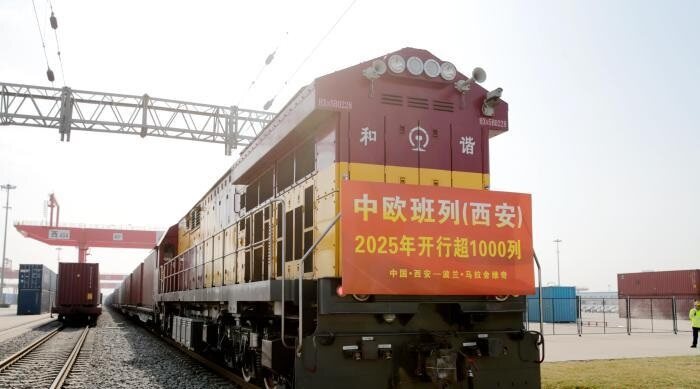 Xi'an, March 21 (by Alina Li) - On March 21, the X8489 China Europe freight train, loaded with electronic products, mechanical parts, and other goods, departed from Xi'an International Port Station, marking that the number of China Europe freight trains (Xi'an) has exceeded 1000 this year, achieving the target 8 days ahead of 2024.