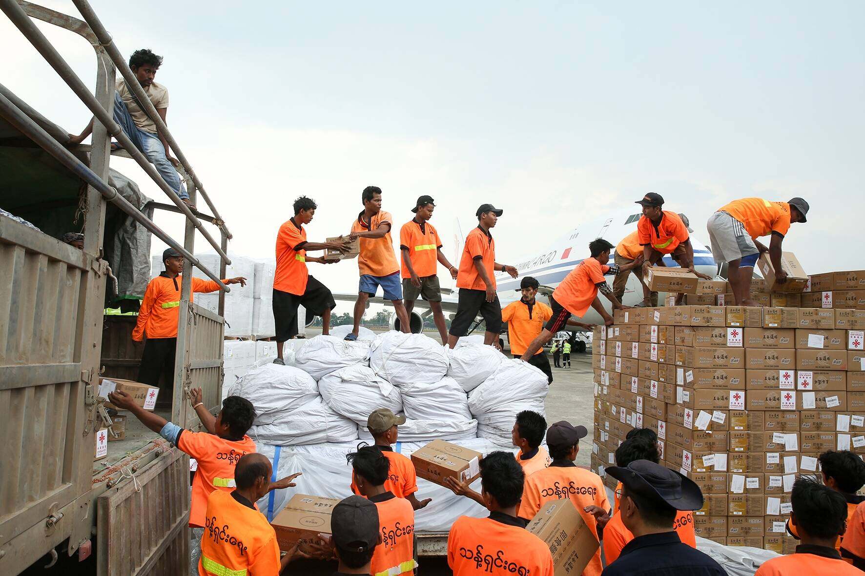 In the early morning of that day, the four Y-20 aircraft landed smoothly one after another at Naypyidaw International Airport. Arriving along with them was the fourth batch of emergency humanitarian earthquake relief aid materials urgently allocated by the Chinese government, including 1,248 tents, 10,000 mosquito nets, 9,000 tarpaulins, and 4,000 sleeping bags, with a total weight of over 102 tons. Moreover, out of great love, the Chinese rescue team members generously donated some of the tents, food, and other materials they had brought to the people in the disaster area, bringing them more warmth and hope. In this large-scale rescue operation, the Chinese People's Liberation Army Air Force dispatched four Y-20 aircraft at one time to carry out an international humanitarian rescue mission, setting a precedent for China's rescue operations. On the same afternoon, the fifth batch of emergency humanitarian earthquake relief aid materials from China arrived smoothly at Yangon International Airport. This batch of materials included 266 tents, 20,000 mosquito nets, 9,000 tarpaulins, and 2,000 cartons of instant noodles, with a total weight of over 91 tons, further enriching the material reserves in the disaster area of Myanmar.