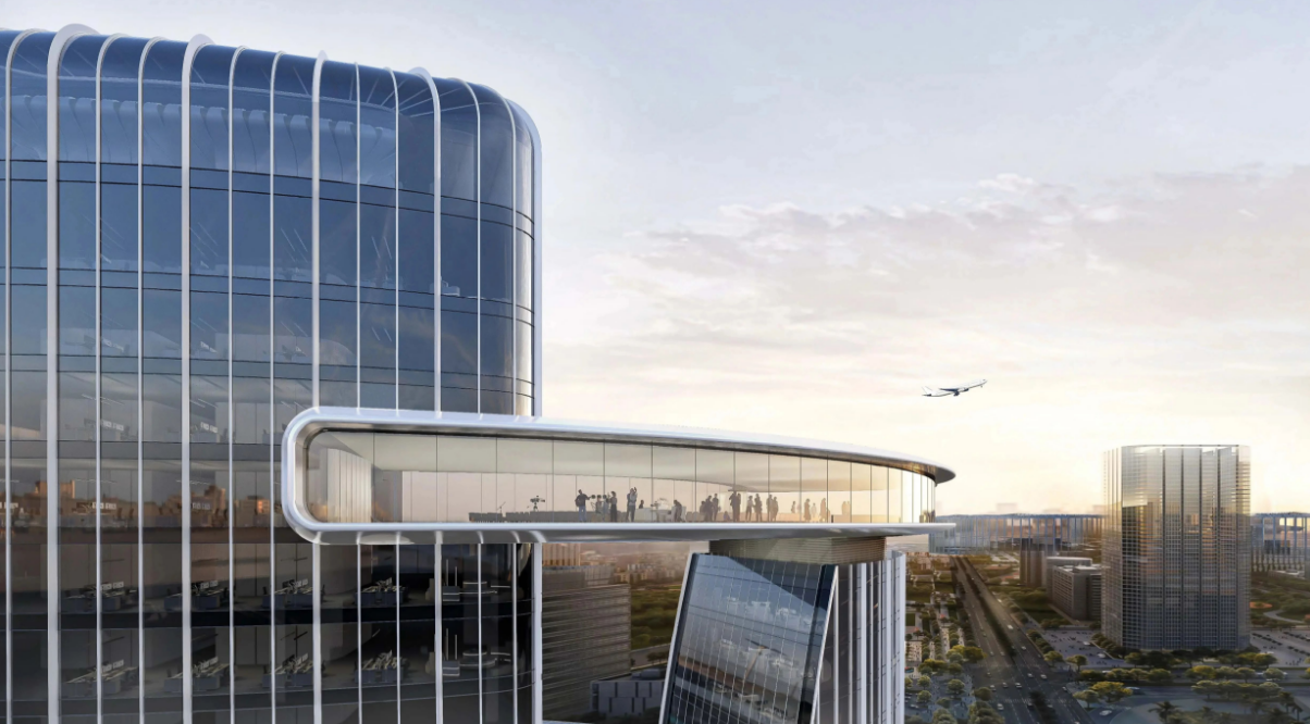 The tower's streamlined façade features a glass curtain wall with a metal grille that simulates the gradient of feathers, creating dynamic lighting and shadow effects in different lighting conditions. The podium is designed as an open commercial space, with a flagship store and sky launch hall along the street, and a multi-level public event area through setbacks and terraces.