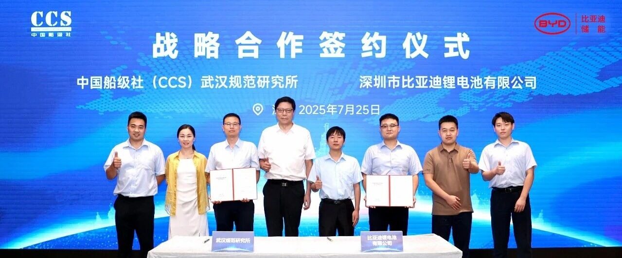 On July 25, 2025, BYD Energy Storage and CCS Wuhan held a strategic cooperation signing ceremony in Pingshan, Shenzhen. Liu Dong, Secretary of the Party Committee of the Wuhan Institute of Standards of China Classification Society, Wei Yingchun, Deputy Director of the Wuhan Institute of Standards of China Classification Society, Huang Chaoxia, Chief Technical Expert of Battery Ship of the Wuhan Institute of Standards of China Classification Society, Jiang Xinjun, Director of BYD Energy Storage New Application Product Line, Jiang Yufeng, Deputy Director of R&D Center, and Wang Hongbo, Sales Director, attended the event.