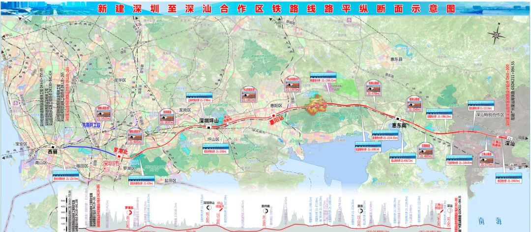 There are six stations along the route, namely Xili, Luohu North, Shenzhen Pingshan, Huizhou South, Huidong, and Shenshan. Among them, the three stations of Xili, Luohu North, and Pingshan will intersect with multiple intercity and subway lines, forming a comprehensive transportation hub. Luohu North Station, as one of the key stations of the Shenzhen Shantou High speed Railway, is located in the Qingshuihe area of Luohu District. It is planned to integrate the Shenzhen Shantou High speed Railway, Metro Lines 3, 14, 17, 25, and intercity railways, and is the core hub of the eastern part of the Greater Bay Area radiating to the eastern Guangdong region.