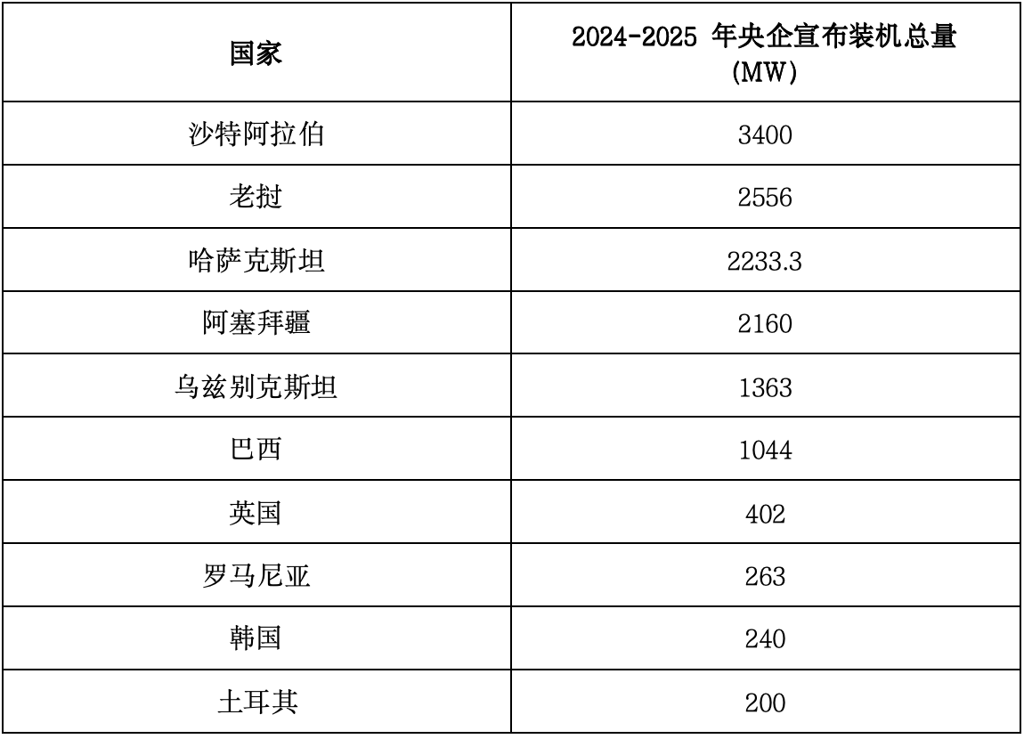 From 2024 to 2025, Saudi Arabia, Laos, Kazakhstan, Azerbaijan, and Uzbekistan will become the top five countries for newly installed capacity of central enterprises. Under the promotion of the China Asia Summit, Chinese enterprises are accelerating their layout in Central Asia, such as the 1 GW photovoltaic project in Uzbekistan becoming the first gigawatt level new energy project in Central Asia.