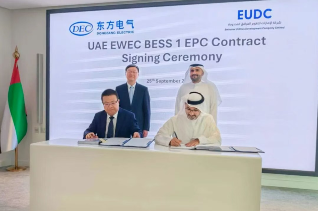 Recently, under the joint witness of Luo Qianyi, Secretary of the Party Committee and Chairman of Dongfang Electric Group, and Yusuf Ali, CEO of Etihad Hydro in the United Arab Emirates, Chen Qiang, Secretary of the Party Committee and Chairman of Dongfang International, and Mohammed Sheikh, CEO of the United Arab Emirates Public Utility Development Company, officially signed the EPC general contract for the BESS1 battery energy storage project in the United Arab Emirates at the Ministry of Energy.