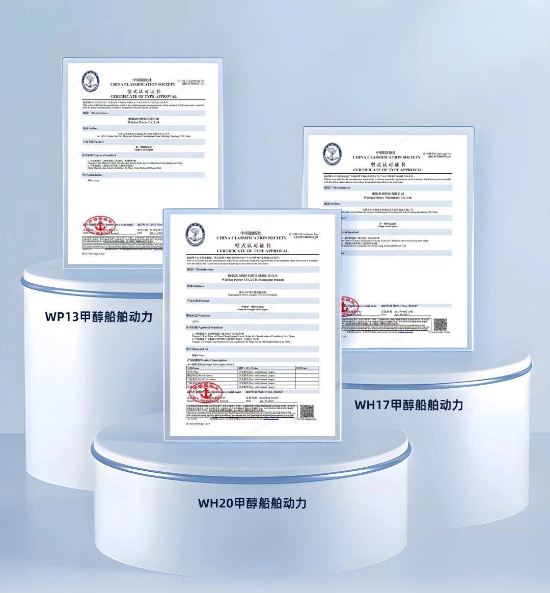 WP13 methanol ship power has completed 2500 hours of degradation test and obtained type approval certificate and emission certificate. WH17 methanol ship power has obtained the first China II emission certificate in China, WH20 methanol ship power has obtained the first diesel micro injection ignition in China, and single methanol fuel engine type approval certificate and emission certificate.