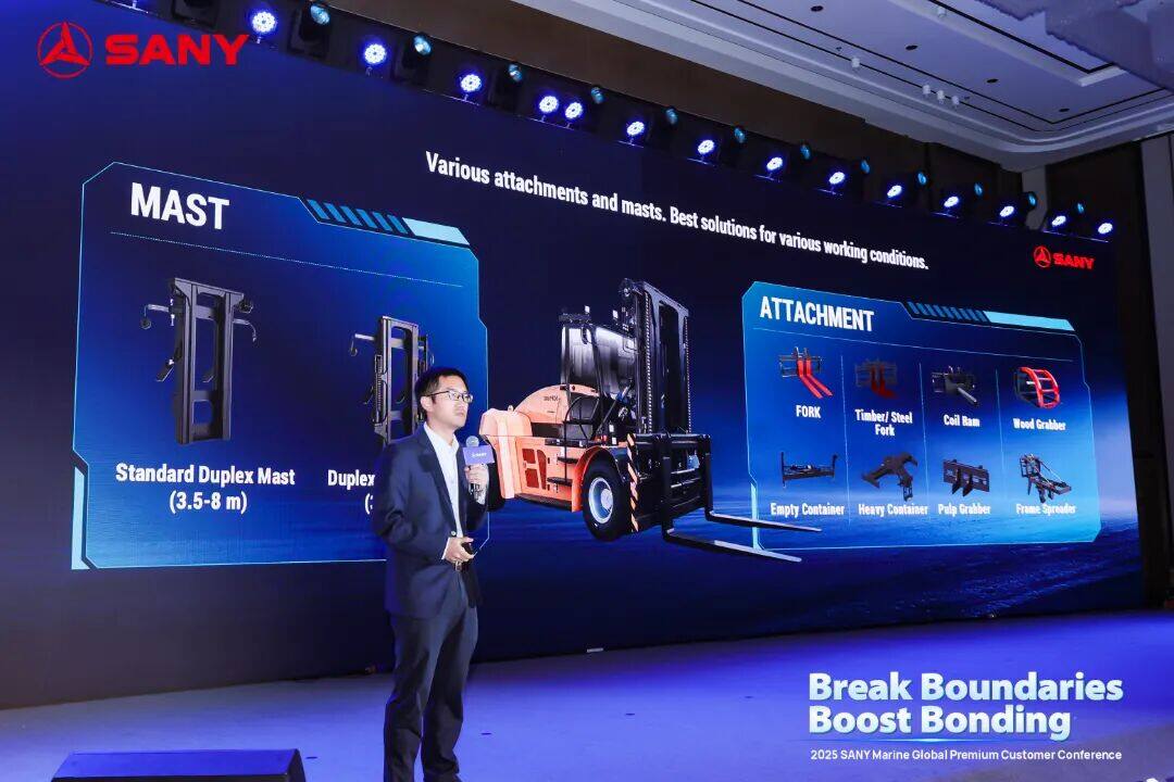 The product development leader of Sany Ocean highlighted the advanced technology and innovative achievements of logistics equipment to global customers and agents: the new pure electric material grabbing machine achieved a dual breakthrough of 9-hour battery life and 20% efficiency improvement; 1 kWh of electricity for an electric forklift is equivalent to 2-2.5L of diesel, significantly reducing energy consumption costs.