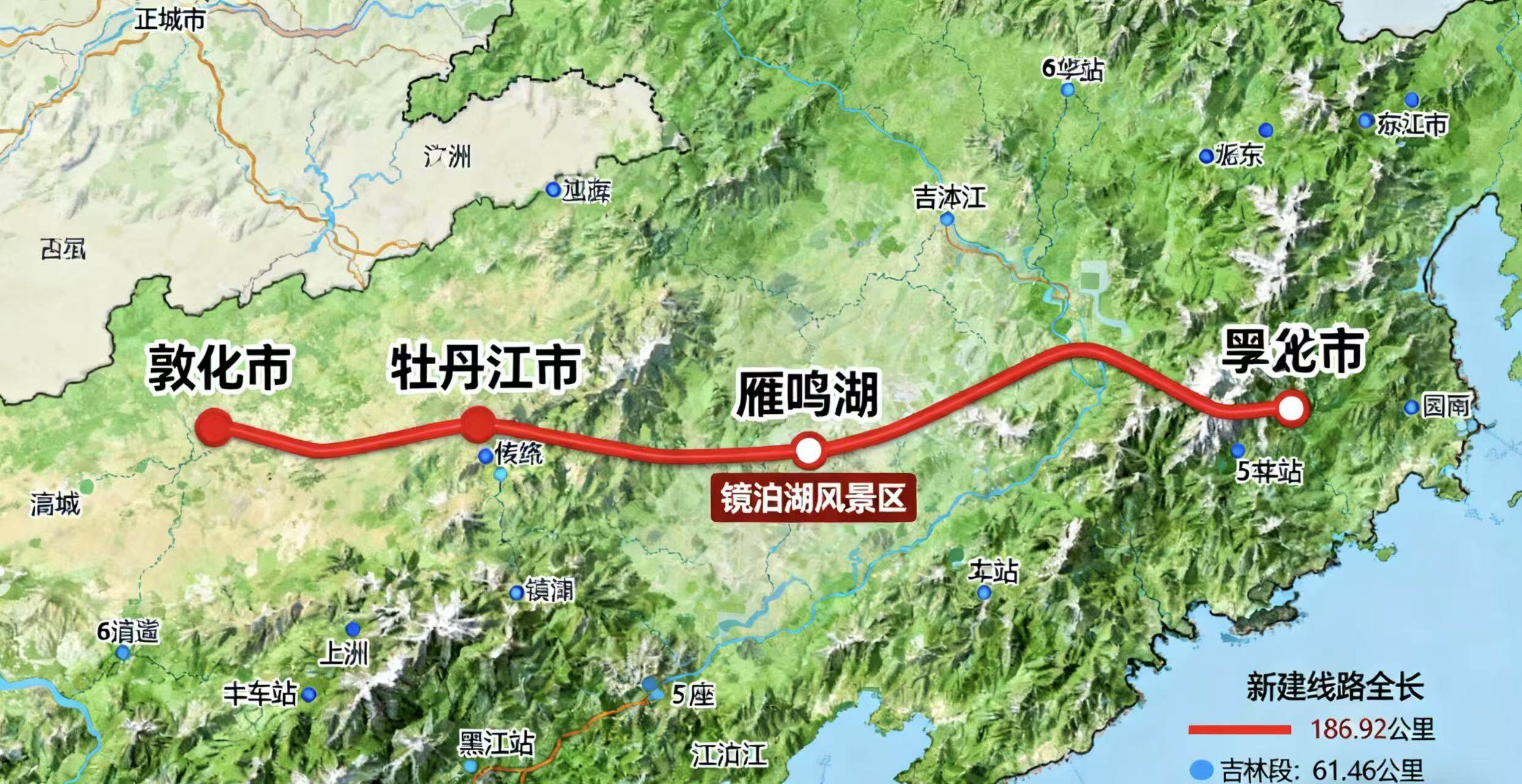 The approval and implementation of the Mudun high-speed railway is an important measure to implement the comprehensive revitalization strategy of Northeast China, and is also a key link in improving the national "eight vertical and eight horizontal" high-speed railway network. The project starts from Dunhua City, Jilin Province, passes through important areas such as Yanming Lake and Jingbo Lake Scenic Area to the north, and ends in Mudanjiang City, Heilongjiang Province. The total length of the newly built line is 186.92 kilometers, including 61.46 kilometers in Jilin and 125.46 kilometers in Heilongjiang. The bridge tunnel ratio of the entire line is as high as 62.94%, demonstrating the complexity and difficulty of the engineering construction. The line adopts the high-speed railway level standard, with a design speed of 250 kilometers per hour, a double track layout, a main line spacing of 4.6 meters, and an effective length of 650 meters for the arrival and departure lines. After completion, it will achieve rapid access between the two places and completely change the traffic bottleneck in the eastern part of Heilongjiang Province, which requires detours to Harbin when leaving the province.