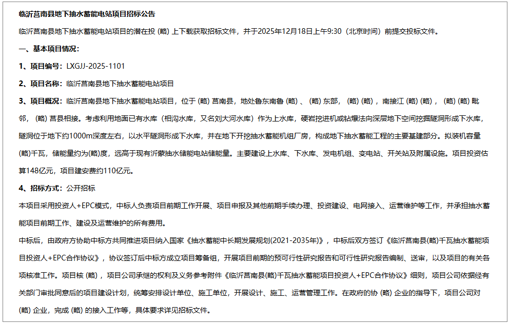 Guided by the "dual carbon" goal, China's energy structure transformation is advancing with unprecedented depth and breadth. On November 27, 2025, a bidding announcement from Linyi Public Resource Trading Center directed the public's attention to a depth of kilometers underground in southeastern Shandong. The underground pumped storage power station project in Junan County, Linyi, Shandong Province has officially started bidding. This super project, with an estimated total investment of 14.8 billion yuan, not only refreshes people's understanding of traditional pumped storage, but also marks a milestone step for China in the development and utilization of deep underground space and large-scale, long-term energy storage technology.