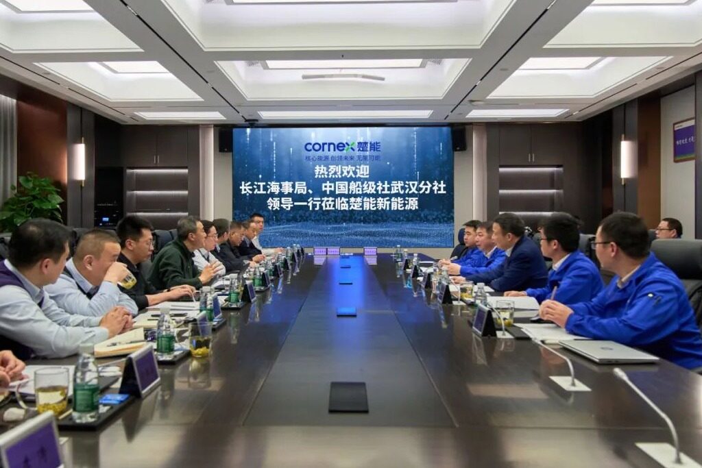 On December 6th, Wang Haiyu, Director of the Yangtze River Maritime Safety Administration, and He Wei, Deputy General Manager of the Wuhan Branch of China Classification Society, visited CORNEX's global headquarters for in-depth discussions on the practical application and safe development of ship electrification. CORNEX Chairman Dai Deming and President Huang Feng accompanied.