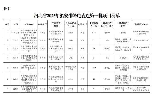On December 17, 2025, the Development and Reform Commission of Hebei Province released the "Announcement of the First Batch of Projects Planned for Green Power Direct Connection in Hebei Province in 2025", marking the official launch of the green power direct connection work in Hebei Province. There are a total of 31 projects announced this time, with a total scale of 4.2775 million kilowatts, including 2.5357 million kilowatts of wind power projects and 1.7419 million kilowatts of photovoltaic projects.