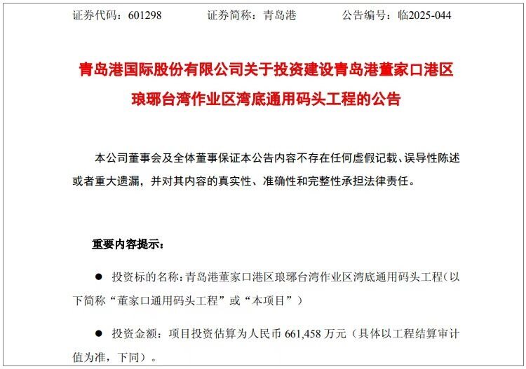 On December 19, 2025, a notice from Qingdao Port (601298) attracted industry attention: it plans to invest 15.7 billion yuan to simultaneously promote two heavyweight terminal projects in Dongjiakou Port Area, namely the first phase of the Langya Taiwan Operating Area Eastern Container Terminal project worth 9.097 billion yuan and the Bay Bottom General Terminal project worth 6.615 billion yuan. Both major projects are planned to be constructed within 4 years and put into operation by 2029. After completion, they will significantly enhance the container and bulk cargo throughput capacity of Qingdao Port, adding a core pivot to its "one bay, two wings, six districts" development pattern, and injecting surging momentum into the high-quality development of the Yellow River Basin and the integrated reform of Shandong Port.