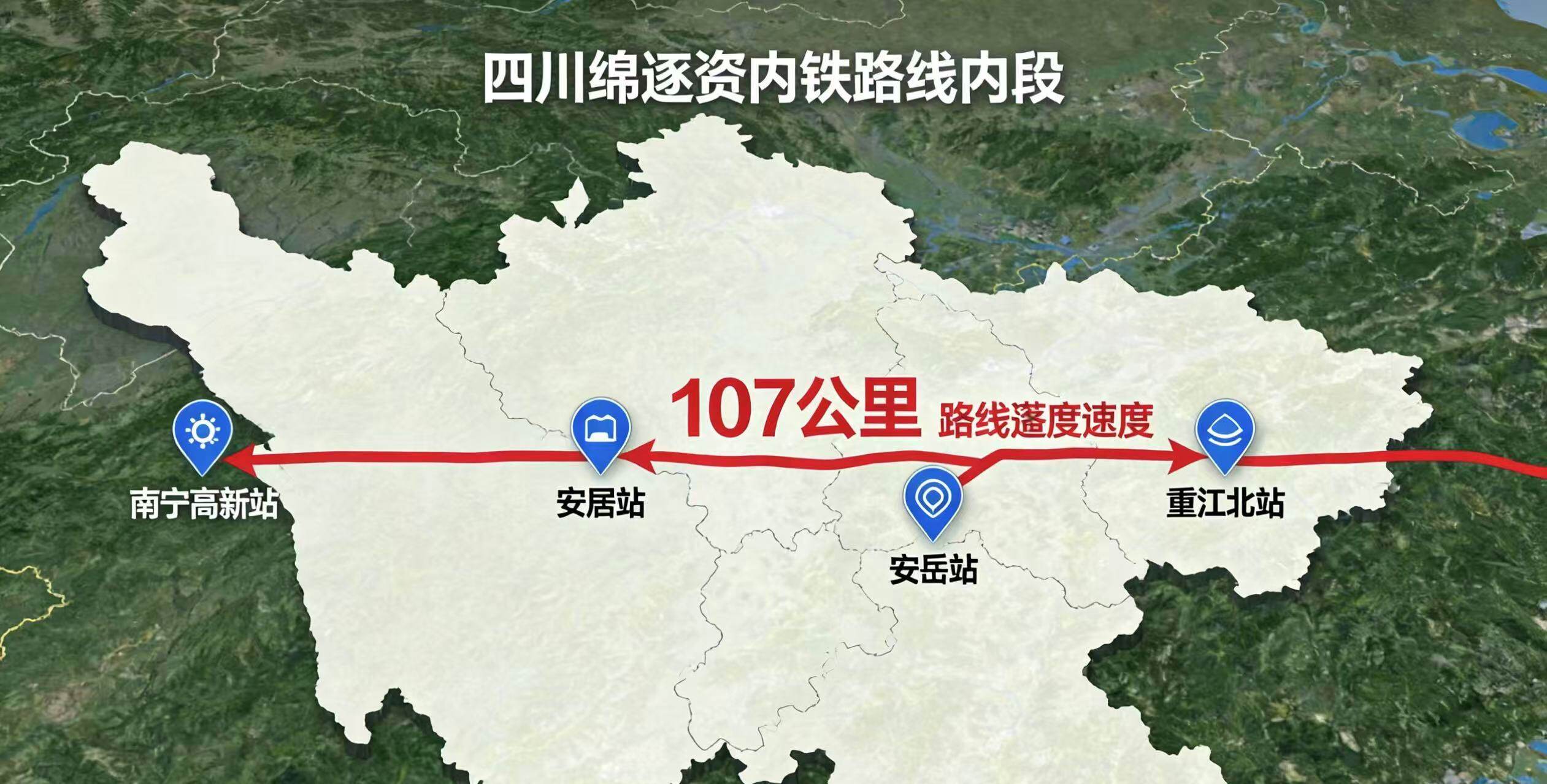 The Suinei section of the Mianyang Suining Zinei Railway is designed with the core layout of "north-south connectivity and efficient connection". It starts from the southern exit of the under construction Suining High tech Station in the north, connects Anju District of Suining City and Anyue County of Ziyang City in the south, and finally connects to the existing Neijiang North Station of the Neijiang Luzhou High speed Railway in Neijiang City. The newly built main line has a total length of 107.786 kilometers and a design speed of 250 kilometers per hour. After completion, it will realize the vision of "half-hour commuting" between cities in central Sichuan.