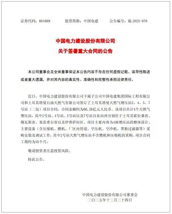 When Türkiye's vast land, natural gas pipelines are waiting for the opportunity of power upgrading, an infrastructure giant from China is injecting new momentum into the efficient operation of the local energy network with a heavy order. On December 23, 2025, POWERCHINA (601669) released a major contract announcement, and its subsidiary, POWERCHINA International Engineering Co., Ltd., officially signed a contract with Türkiye Taman Oil and Gas Co., Ltd. to undertake the construction of Türkiye Taman Gas Booster Station 2, 4, 5, and 7 (second package) projects, with a contract amount of up to 6.626 billion yuan, which also became another landmark achievement of POWERCHINA in the field of energy infrastructure in West Asia.