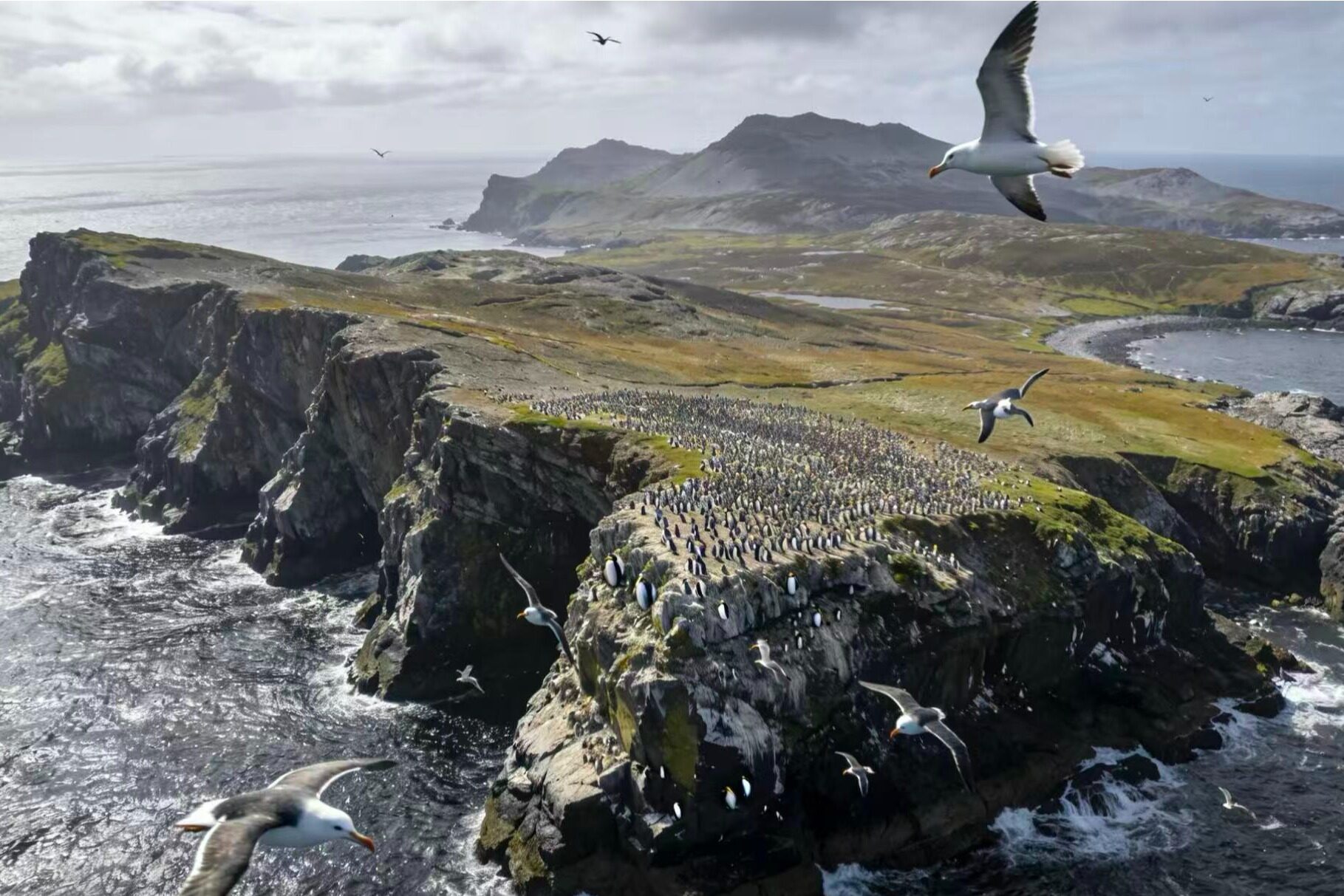 Under the long sky, albatrosses spread their wingspan of nearly three meters and soar in the wind. They are masters of flying in the Southern Ocean, knowing how to ally with the wind, soaring and hovering on the rising air currents, and breaking through the sky with the force of diving. They can fly for thousands of kilometers without flapping their wings once. In the nest on the cliff, fluffy young birds have to wait for nearly three hundred days and nights, accumulating strength through the feeding of their parents back and forth across the ocean, until their wings are full, before they can tremblingly leap out of the nest and complete their first flapping of wings in life. At the top of the steep cliff, blue eyed cormorants watch over the sea and sky with their deep blue eyes. They are messengers connecting the sea and land. At dawn, they form teams and fly towards the sea, their agile figures sweeping over the waves and diving 30 meters deep to hunt for fish and shrimp; At dusk, he returned with a full load and accurately landed on the cliff nest, feeding the food in his crop to the hungry young birds.