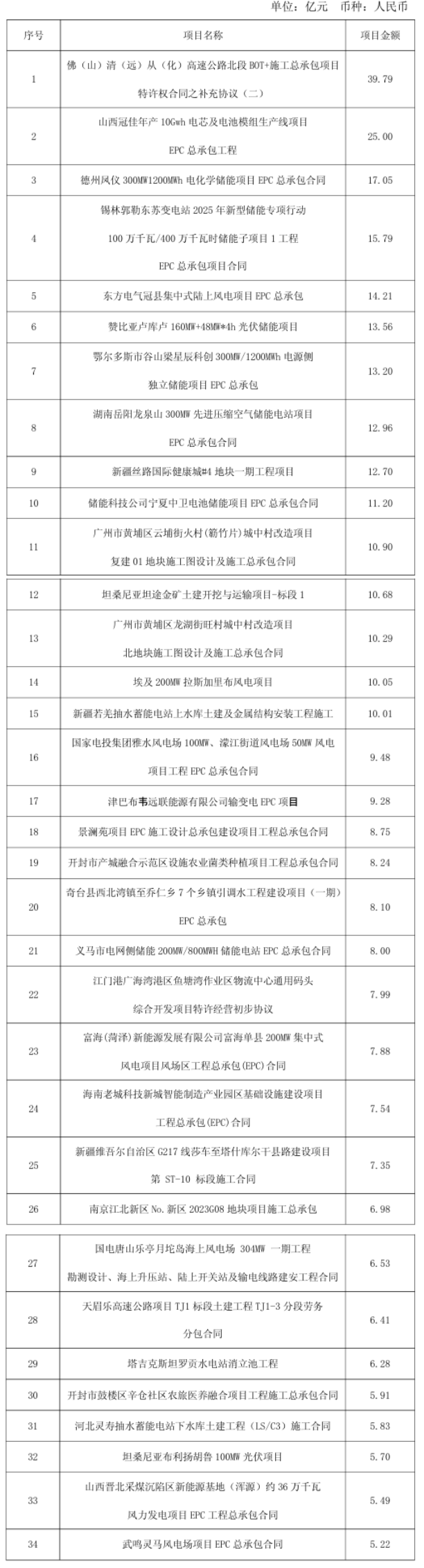 The most intriguing data in this announcement is undoubtedly the breakthrough in the new energy storage business. Although not included in the aforementioned segmented business growth rate statistics, the announcement separately disclosed that from January to November this year, China Power Construction signed 180 new projects in the field of new energy storage, with a contract amount of up to 500.03 billion yuan. Especially in 34 major projects with a contract amount of over 500 million yuan, energy storage projects occupy 7 seats, demonstrating the company's strong ability to win large orders in this field.