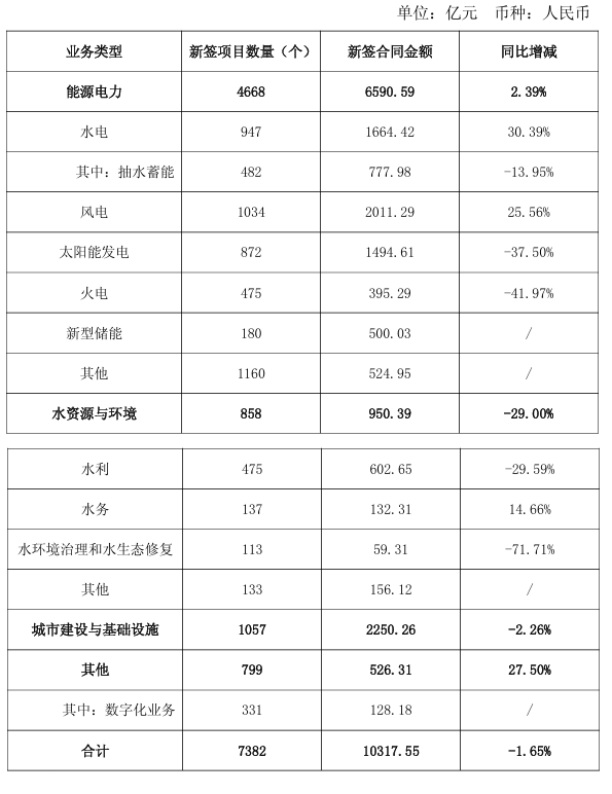 According to the announcement, China Power Construction has signed a total of 7382 new projects in the past 11 months, with a total new contract amount of 1031.755 billion yuan, a slight decrease of 1.65% compared to the same period last year. This overall stable performance report contains significant structural changes.