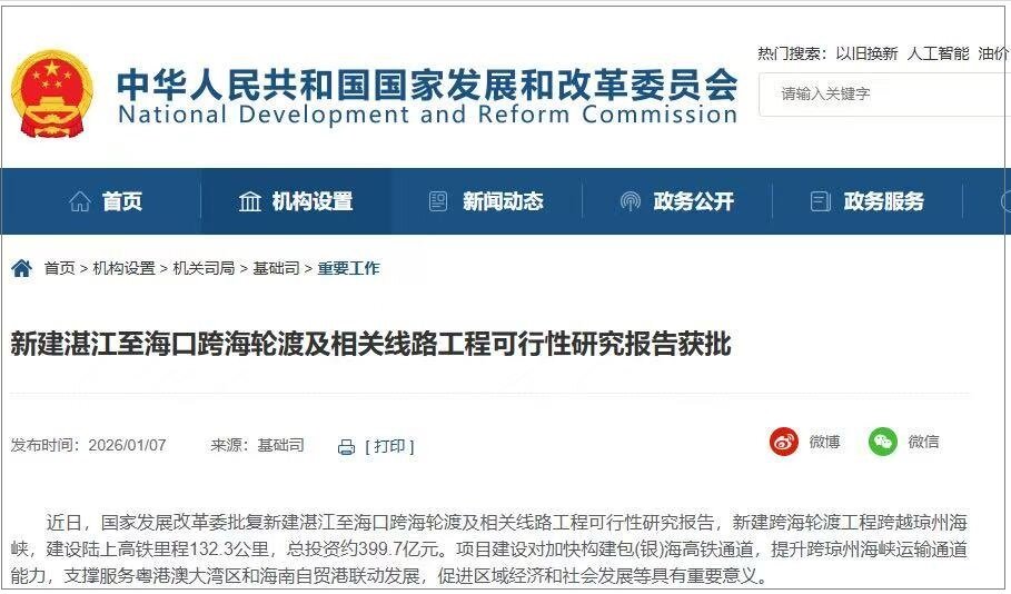 On January 7, 2026, Beijing, the National Development and Reform Commission officially approved the feasibility study report for the construction of a new Zhanjiang Haikou cross sea ferry and related line project. This super project, with a total investment of about 39.97 billion yuan, will break down the transportation barriers in the Qiongzhou Strait, achieve interconnectivity between the Hainan Island high-speed railway and the national high-speed railway network, and inject strong transportation momentum into the construction of the Hainan Free Trade Port.
