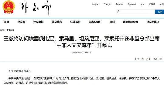In the early morning of Addis Ababa, the sun shines on the headquarters building of the African Union. On January 8th local time, Wang Yi, member of the Political Bureau of the Communist Party of China Central Committee and Minister of Foreign Affairs, pressed the start button here, officially kicking off the "China Africa Cultural Exchange Year" in 2026. This is the first highlight of Wang Yi's trip to Africa, and it is also the 36th consecutive year that Chinese Foreign Ministers have visited Africa for the first time at the beginning of the year, continuing the diplomatic tradition that has never stopped since 1991.
