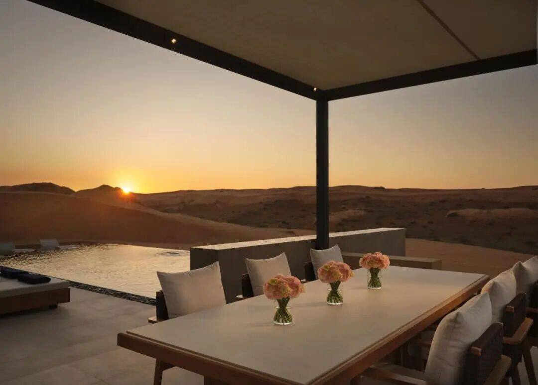 101 independent villas are scattered like pearls in the vast sand sea, ensuring ultimate privacy and openness. The basic pool villa covers an area of 158 square meters, and you can also receive greetings from antelopes while taking a bath by the pool.