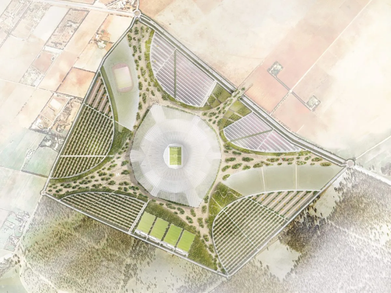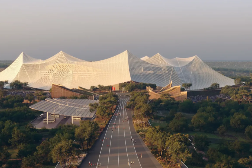 The design scheme for Hassan II Stadium originated from a fierce international competition, ultimately won by the Paris based Oualalou+Choi agency in collaboration with the world's top sports architecture company Populous. This innovative design not only allows natural light to gently diffuse into the venue, but also outlines highly recognizable contours on the skyline. The roof is supported by a circular structure consisting of 32 staircases, serving as an entrance and creating a lush sky garden at a height of 28 meters.