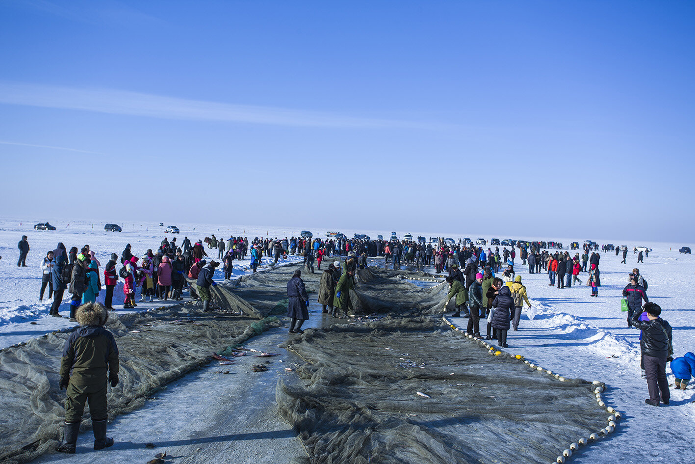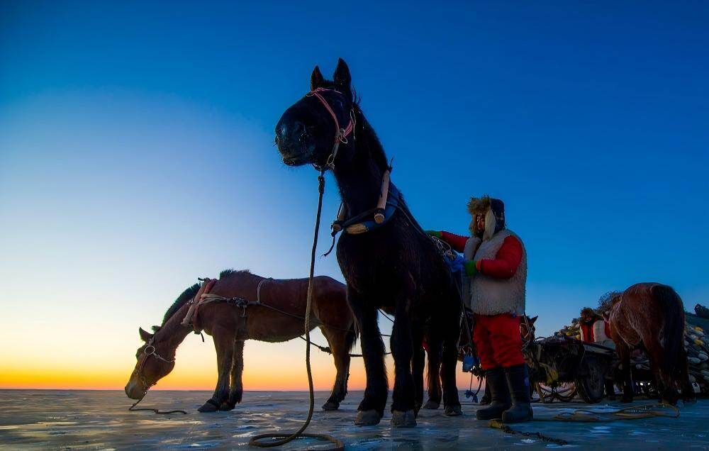 After several hours of waiting, as noon approached, the time to close the network arrived. This is the most visually impactful part of winter fishing. The fishing net weighs thousands of pounds when submerged in water under the ice, and modern machinery has retired here, replaced by an ancient and powerful method - a horse drawn winch.