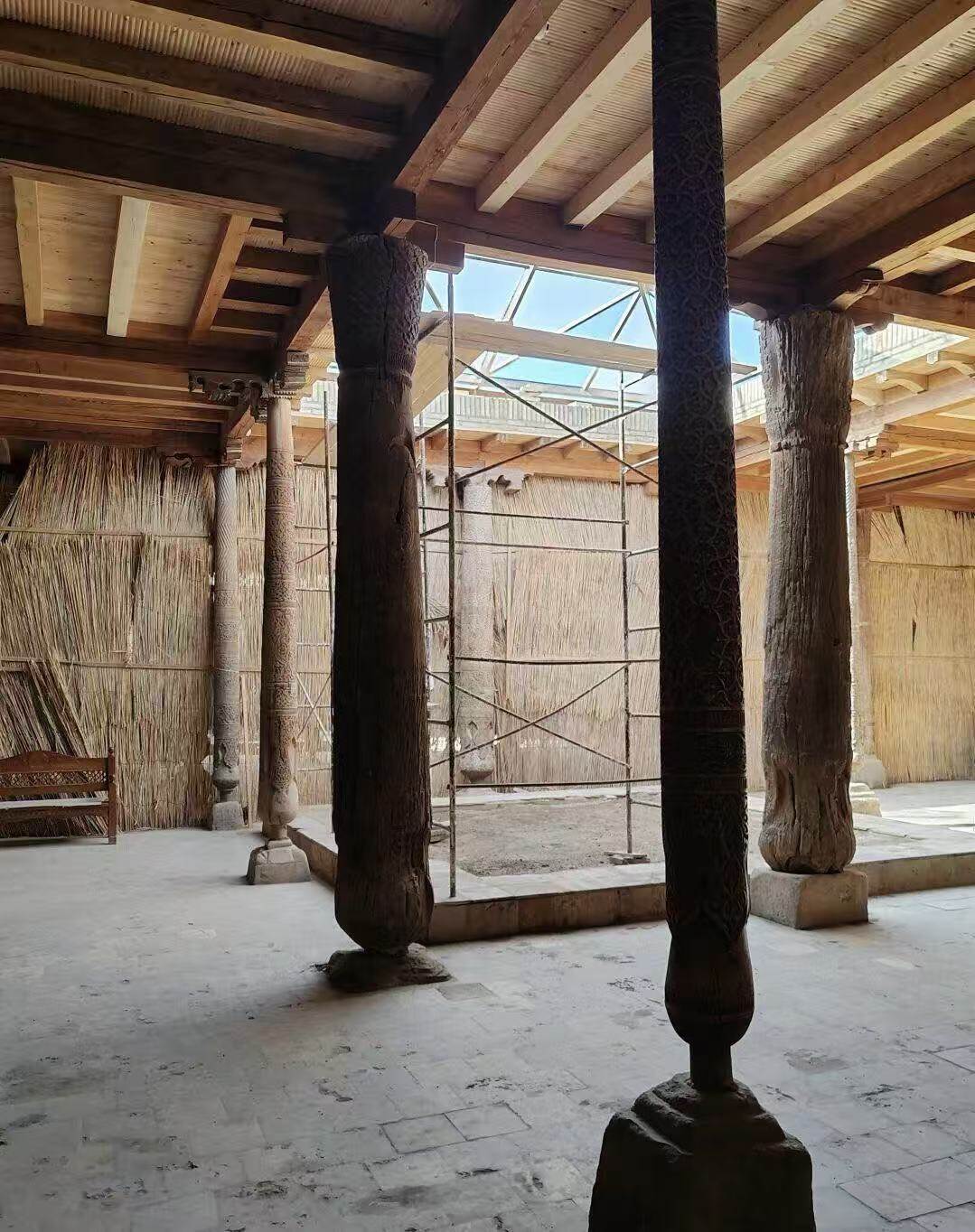 The worship hall, supported by 218 wooden columns, is renowned for its exquisite carving craftsmanship, reflecting the pinnacle of Central Asian woodcarving art.