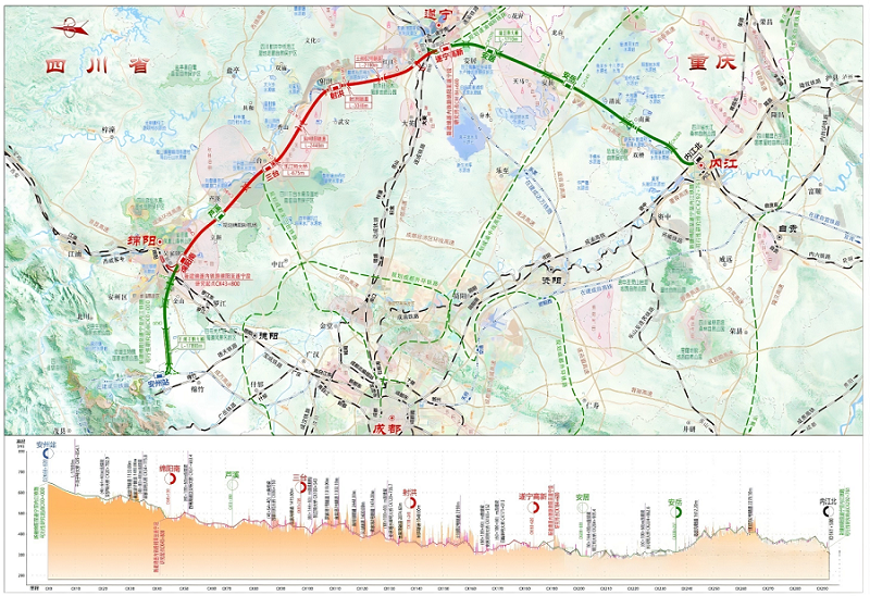 Firstly, it will greatly improve the transportation network of the Chengdu metropolitan area. After the completion of the project, it will be connected to multiple mainline railways such as Xicheng High speed Railway, Chengda Wan High speed Railway, Shanghai Chengdu Railway, Mianyang Luzhou High speed Railway, etc., forming the fastest high-speed railway channel from Mianyang and Suining to Wuhan, Chongqing, Guiyang, as well as the Yangtze River Delta and Guangdong Hong Kong Macao Greater Bay Area directions. The directions from Suining and Neijiang to Beijing and Kunming will also be more convenient.