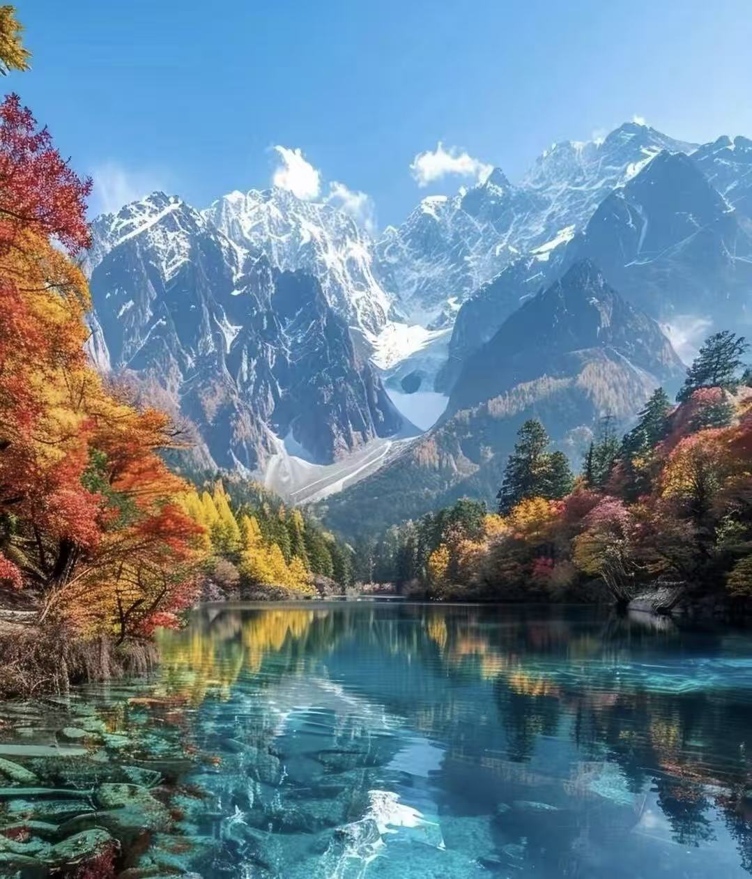 Jiuzhaigou Valley Scenic and Historic Interest Area World Natural Heritage (1992), "fairyland on earth" and "fairy tale world". Named after 9 Tibetan villages, it is known for its five wonders of "emerald sea, cascading waterfalls, colorful forests, snowy peaks, and Tibetan sentiment". 114 high mountain lakes are scattered like jewels, the calcium carbonate pool gradually changes in blue-green color, and the Pearl Beach Waterfall is 200 meters wide with a drop of 40 meters, splashing like pearls. Primitive forests cover the lake, with a variety of rare animals and plants. In autumn, colorful forests reflect the lake surface, and the water is as colorful as a palette, making it the most generous gift of nature.