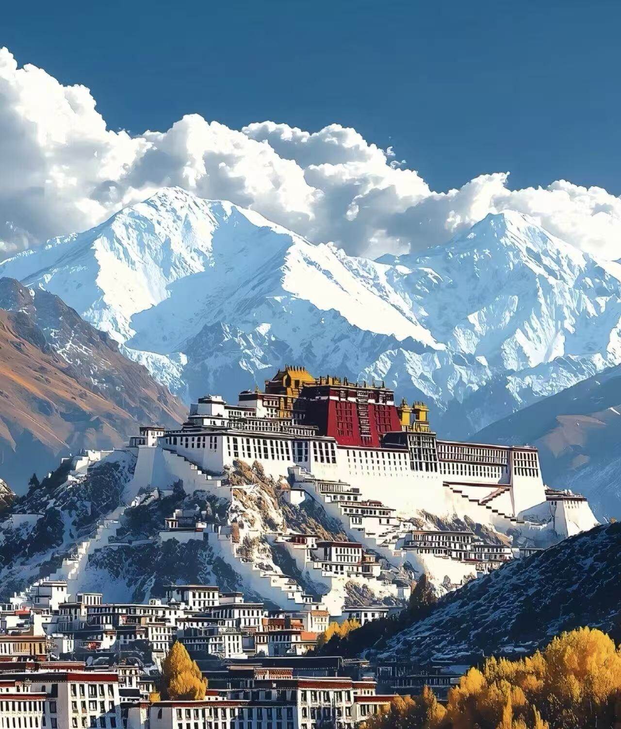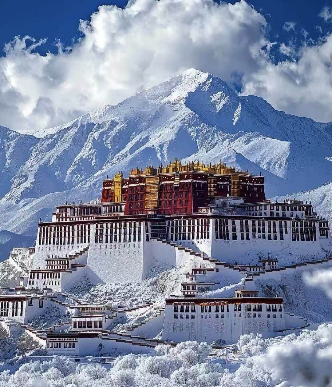Potala Palace World Cultural Heritage Site (1994), "Pearl on the Roof of the World". Founded in the 7th century during the Songtsen Gampo era, it has an altitude of 3700 meters and covers an area of 410000 square meters. The main building has 13 floors and is 117 meters high. The White House is the residence of the Dalai Lama, while the Red Palace consists of a Buddhist temple and a stupa. The temple houses over 2000 Buddha statues, and the fifth Dalai Lama's stupa is adorned with 3721 kilograms of gold and over 100000 gemstones. Built against the mountain, it is majestic and represents the pinnacle of Tibetan architectural art, as well as a model of the fusion of Tibetan and Han cultures.