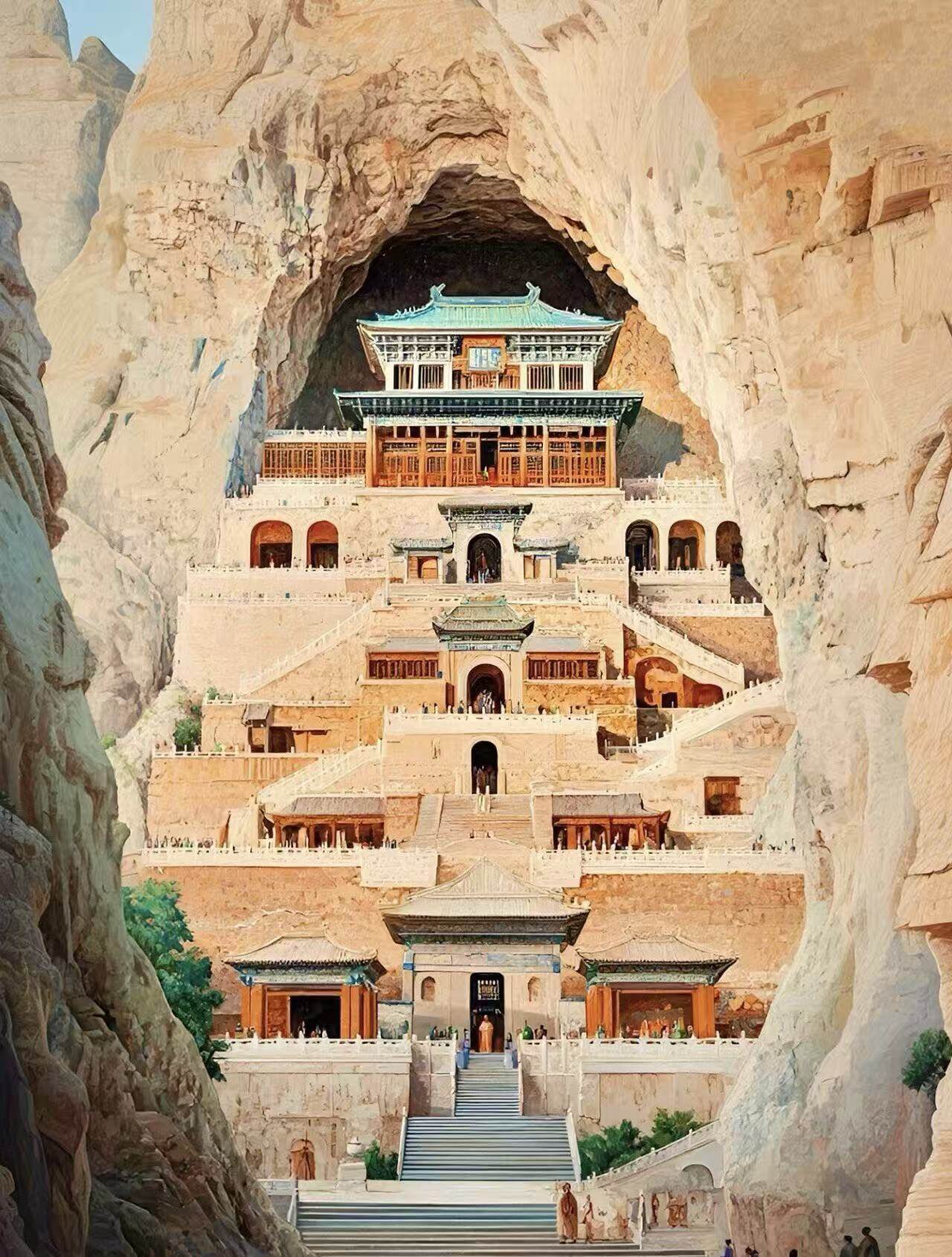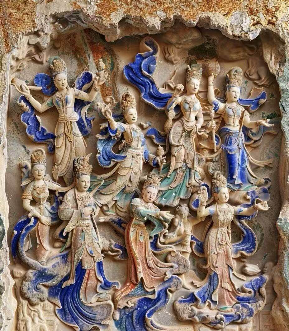 The Mogao Grottoes of Dunhuang World Cultural Heritage (1987), "art treasure house in the desert". Founded in the Former Qin Dynasty (366 AD), after thousands of years of excavation and construction, there are currently 735 caves, 45000 square meters of murals, and 2415 colored sculptures. The mural themes cover Buddhist stories, mountain scenery, and social life. The flying image is light and agile, and it is the crystallization of the integration of Eastern and Western civilizations. More than 50000 documents unearthed from the scripture cave are known as the "encyclopedia of China's medieval era".