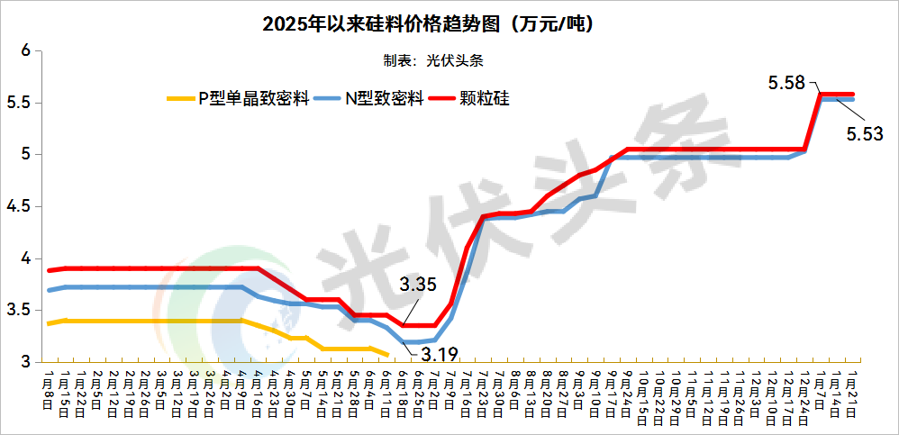 In 2025, the price of silicon materials showed a trend of "bottoming out in the first half of the year and rising in the second half of the year". The price of N-type dense materials dropped from 37000 yuan/ton at the beginning of the year to 31900 yuan/ton. In the second half of the year, it gradually increased with the implementation of industry anti involution measures, and remained stable at 55300 yuan/ton at the end of the year, maintaining a high level in January 2026.