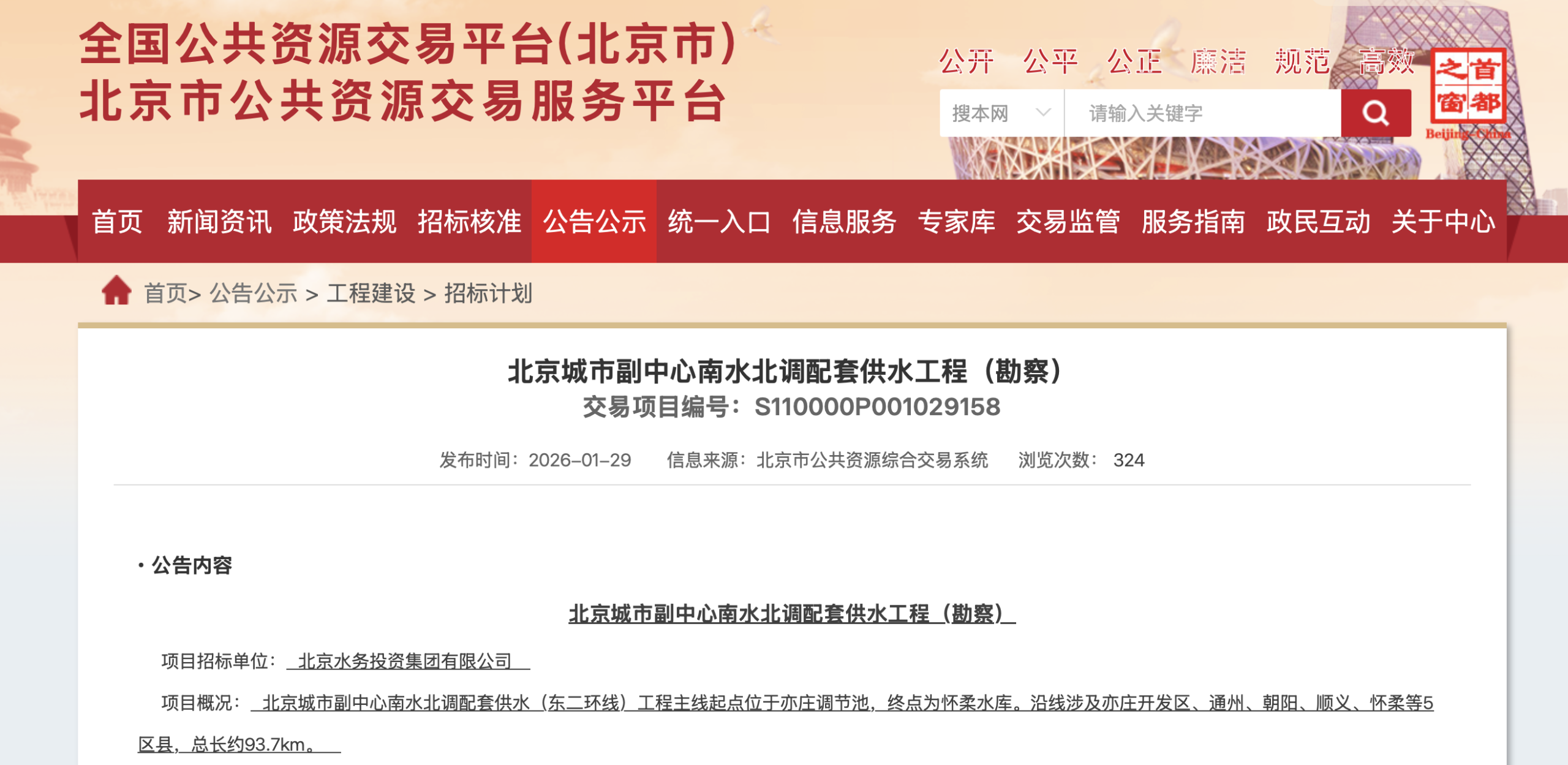 The survey and design work for the South to North Water Diversion Supporting Water Supply Project in Beijing's urban sub center has opened for bidding. This underground lifeline, with a total length of 93.7 kilometers and a total investment of 14.375 billion yuan, has taken a crucial step from early planning to implementation. The water flow remains stagnant, and the survey takes precedence. This preliminary battle, which concerns the water supply safety of the sub center of Beijing and even the entire northern region of Beijing, has already begun.