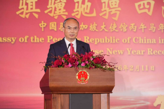 In his speech, Ambassador Cao vividly expounded the beautiful implication of the Year of Horse and the cultural charm of the Spring Festival, and sent New Year greetings to the guests. He said that in the past year, the CPC led the Chinese people to face difficulties and forge ahead, promote national development to achieve new major achievements, and achieve the successful conclusion of the "14th Five Year Plan". China and Singapore seize the opportunity of the 35th anniversary of the establishment of diplomatic relations, maintain close high-level exchanges, deepen pragmatic cooperation, and effectively enhance people to people exchanges. 2026 is the starting year of China's 15th Five Year Plan. China will continue to anchor the goal of comprehensively building a socialist modernized strong country, solidly promote high-quality development, hold high the glorious banner of a community with a shared future for mankind, and firmly uphold international fairness and justice. China is willing to work with Singapore to implement the important consensus reached by the leaders of the two countries and promote the sustained and in-depth development of bilateral relations.