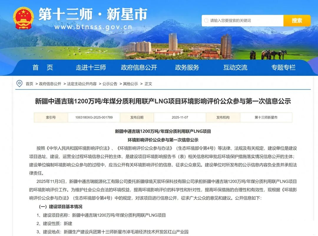 Recently, Xinjiang Zhongtong Jirui Energy and Chemical Co., Ltd. officially released the "Second Public Announcement of Environmental Impact Assessment for Xinjiang Zhongtong Jirui 12 Million Tons/Year Coal Quality Utilization and Co production LNG Project". This behemoth with a total investment of 17 billion yuan is located in Hongshan Industrial Park, Naomaohu Economic and Technological Development Zone, Xinxing City, 13th Division of Xinjiang Production and Construction Corps, with a construction nature of new construction.