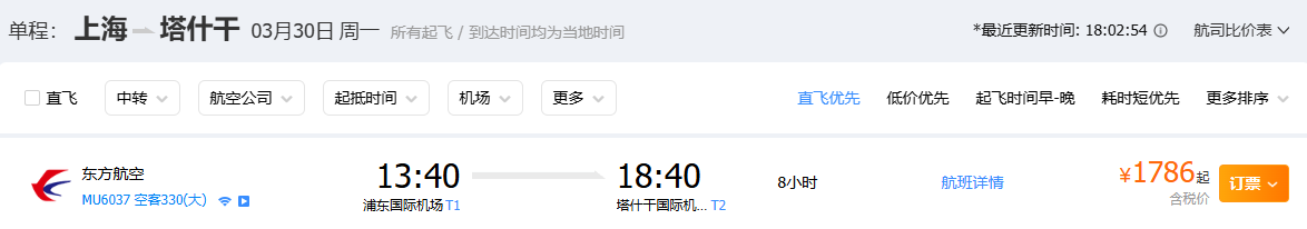 The round-trip flight numbers for the "Shanghai Tashkent" route are MU6037/MU6038, with four round-trip flights per week, planned to operate on Mondays, Tuesdays, Thursdays, and Saturdays. The outbound flight departed from Shanghai Pudong International Airport at 13:40 Beijing time and arrived at Tashkent International Airport at 18:40 local time; The return flight departs from Tashkent at 20:20 local time and returns to Shanghai at 06:15 Beijing time the next day.