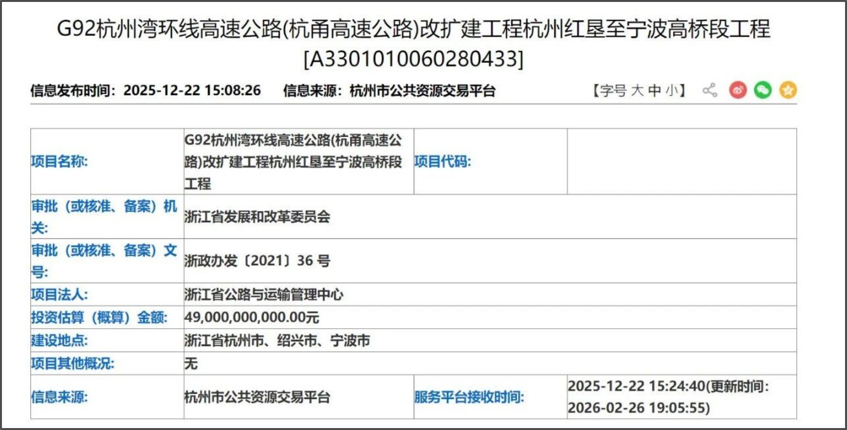 The G92 Hangzhou Bay Area Ring Expressway is one of the six regional ring roads in the national highway network plan and a core component of the fifth ring road network in Zhejiang Province. The planned renovation and expansion of the Hangzhou Hongken to Ningbo Gaoqiao section is an economic artery that connects the three major cities of Hangzhou, Shaoxing, and Ningbo. After the completion of the project, it will effectively alleviate the congestion of the Hangzhou Ningbo Expressway, significantly improve the traffic capacity and service level of the national expressway corridor, and provide a solid infrastructure guarantee for the deepening of industrial synergy, factor flow, and the integrated development of the Yangtze River Delta in the southern wing of Hangzhou Bay. Editor/Gao Xue