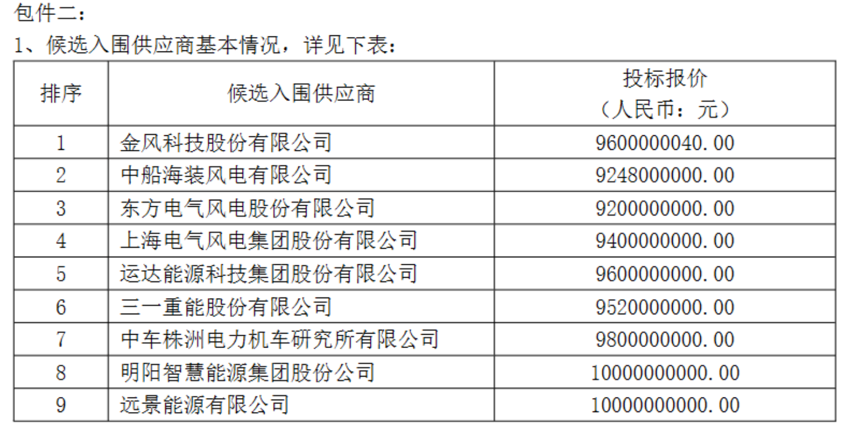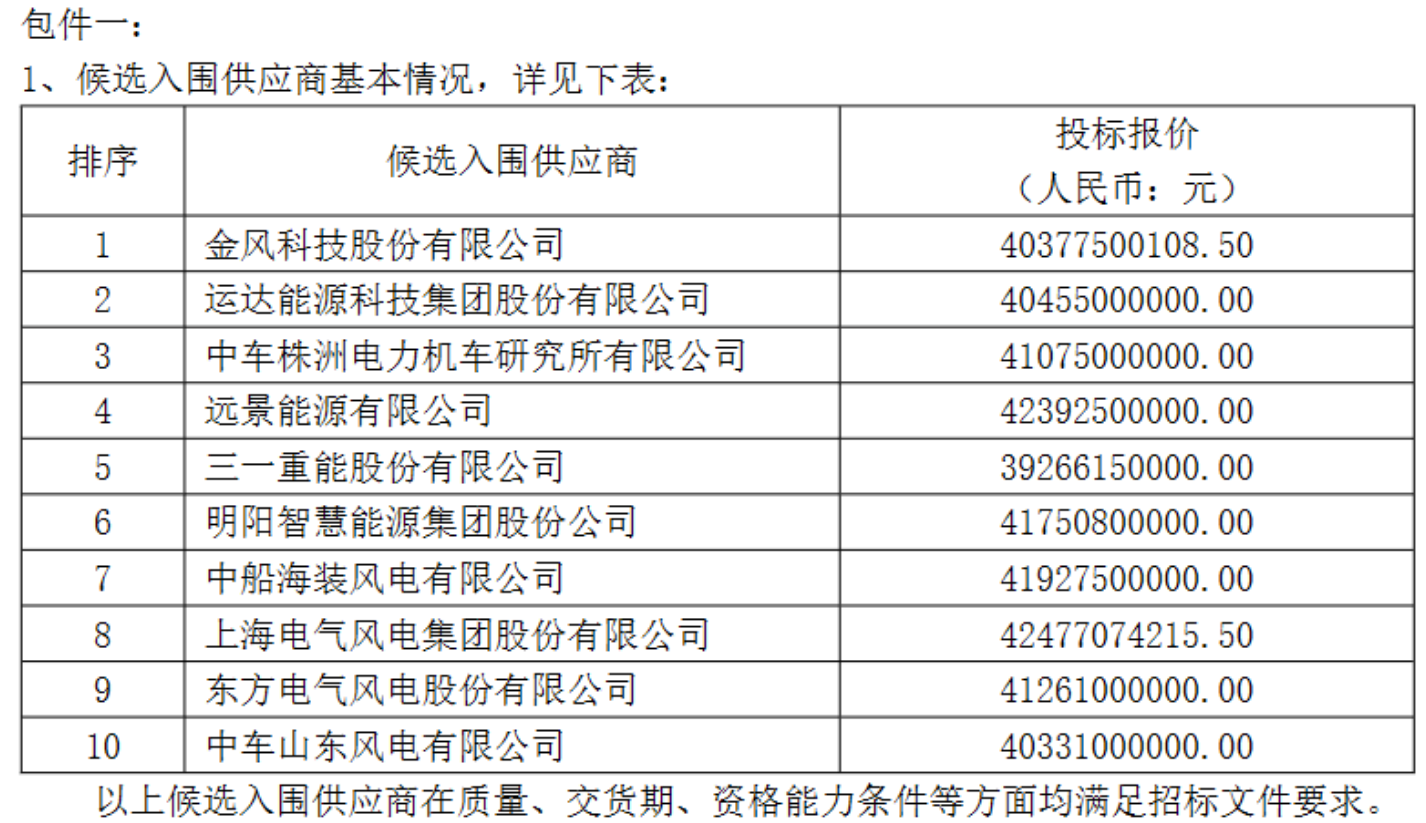 In the largest onshore wind power package, ten mainstream manufacturers including Goldwind Technology, Yunda Co., Ltd., Yuanjing Energy, Mingyang Intelligent, Sany Heavy Energy, CRRC Zhuzhou Institute, CSSC Haizhuang, Electric Wind Power, Dongfang Wind Power, and CRRC Shandong Wind Power were all shortlisted. From the bidding price perspective, Sany Heavy Energy leads the low price camp with a total price of about 39.266 billion yuan, followed closely by CRRC Shandong Wind Power and Goldwind Technology with a total price of about 40.331 billion yuan and 40.378 billion yuan respectively. The difference between the highest and lowest quotations exceeds 3 billion yuan, reflecting significant differences among manufacturers in cost control, supply chain management, and market strategies.