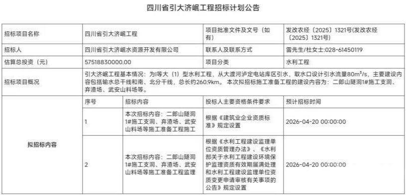 A water conservancy project with a total investment of 57.51883 billion yuan, known as "No. 2 Dujiangyan Irrigation Project", was officially launched for construction preparation and supervision bidding.