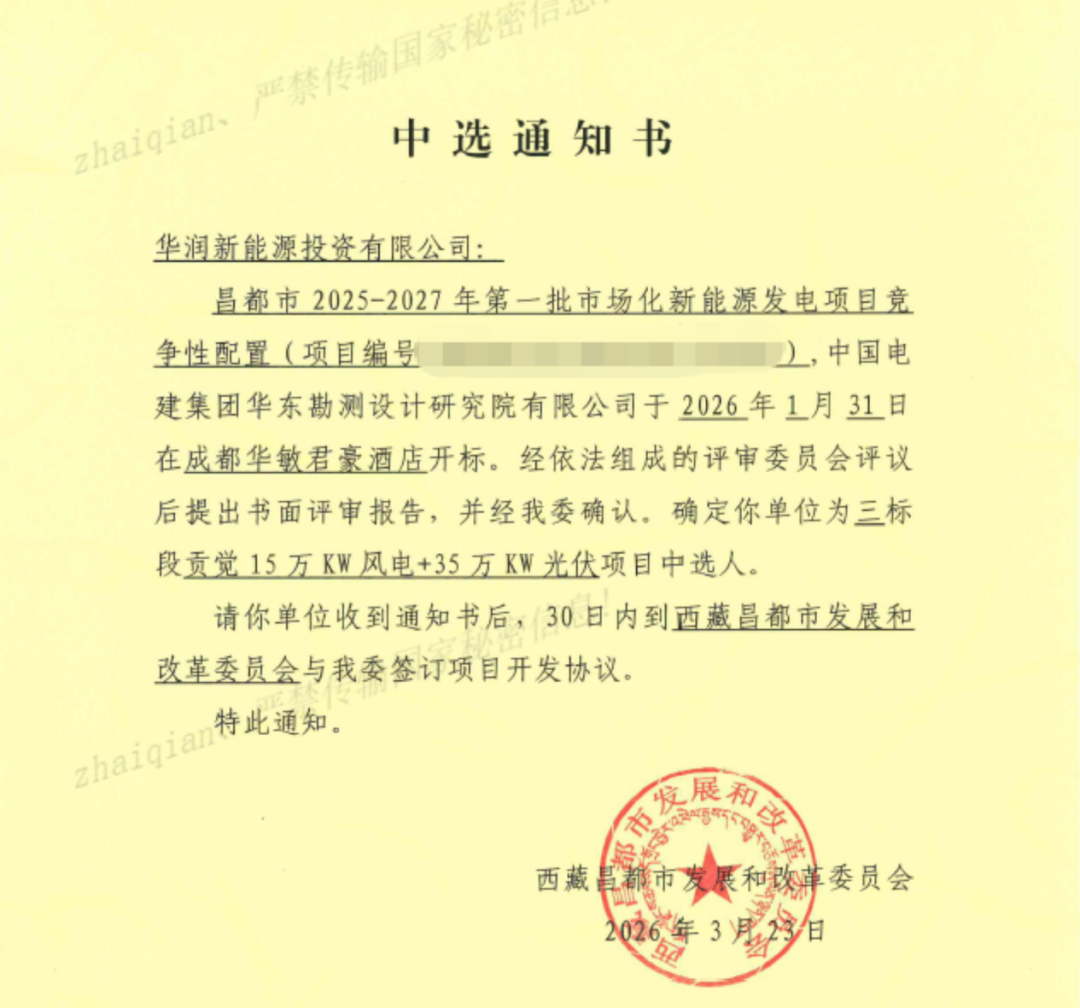 On March 23, the Sichuan Company received the Notice of Selection from the Xizang Changdu Development and Reform Commission. The company successfully won the development indicators of the 500MW landscape project in Gongjue County, Changdu, including 150MW wind power and 350MW photovoltaic power. After the project is put into operation, it is estimated that the annual power generation will be about 1 billion kWh, the annual standard coal will be saved about 306400 tons, and the carbon dioxide emissions will be reduced about 839500 tons.