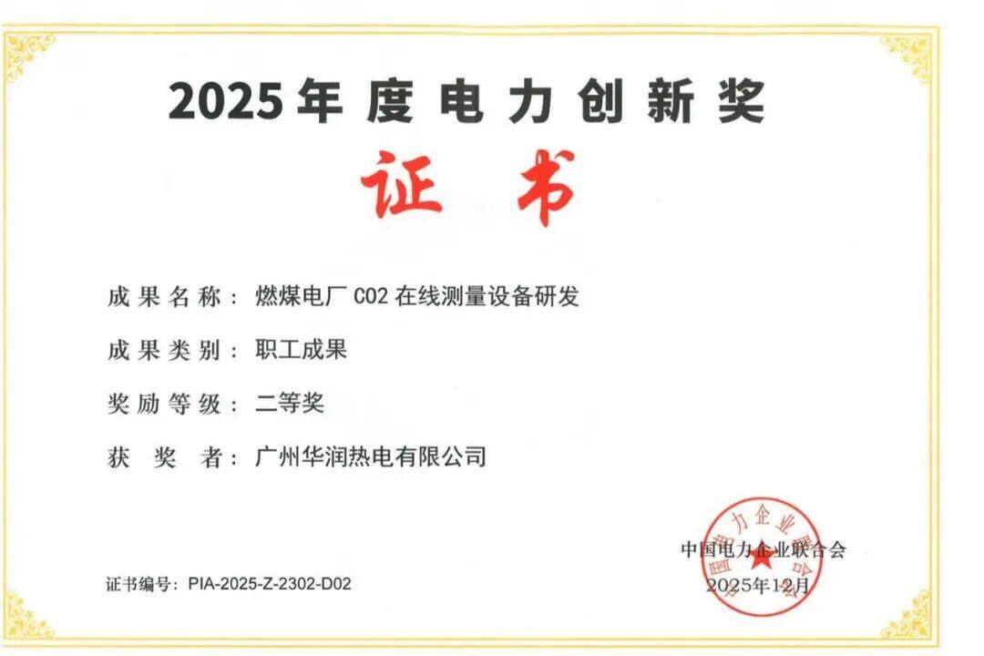 On March 3rd, the list of winners for the 2025 Power Innovation Award of the China Electricity Council was officially announced. Guangzhou Huarun Thermal Power Co., Ltd. and Southern Power Grid Electric Power Technology Co., Ltd. jointly developed and implemented the "Research and Development of Online Carbon Dioxide Measurement Equipment for Coal fired Power Plants" in Unit # 1 of Guangzhou Huarun Thermal Power Co., Ltd., which won the second prize.