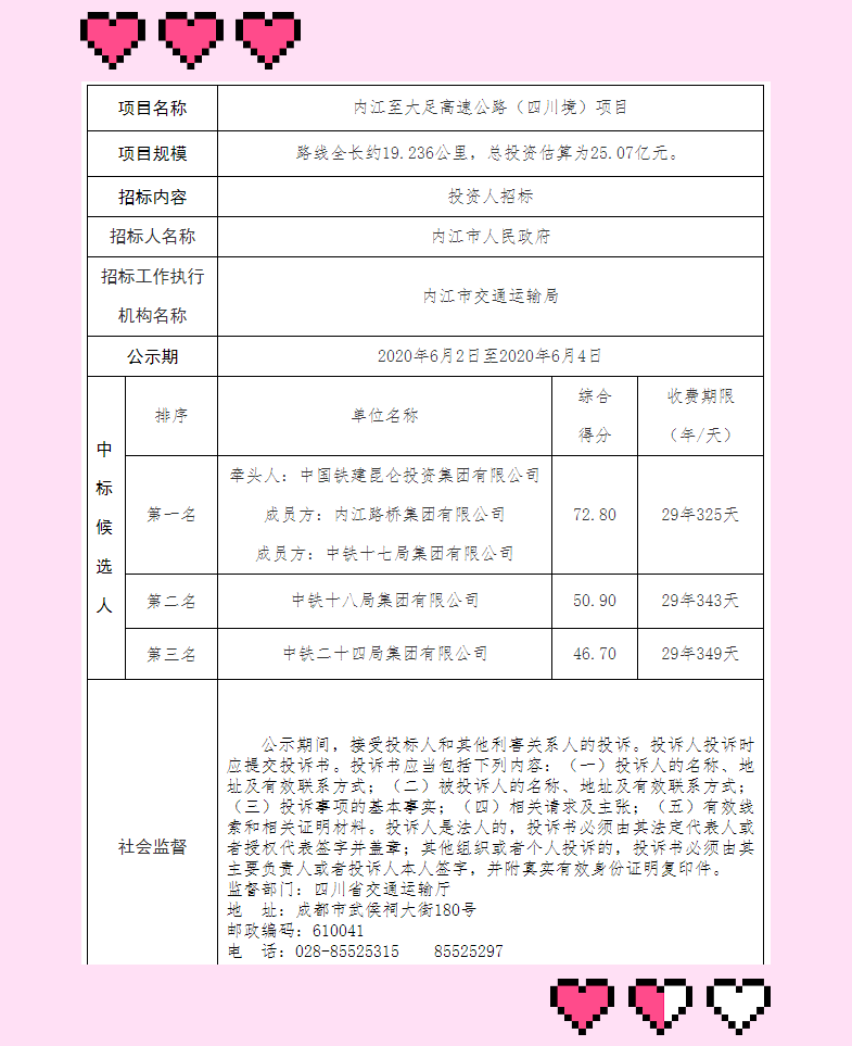 On June 2, 2020, Sichuan Transportation announced that China Railway Construction Kunlun Investment Group as the lead, Neijiang Road and Bridge Group and China Railway 17th Bureau won the bid for the Sichuan border project of the Neijiang-Dazu Expressway.