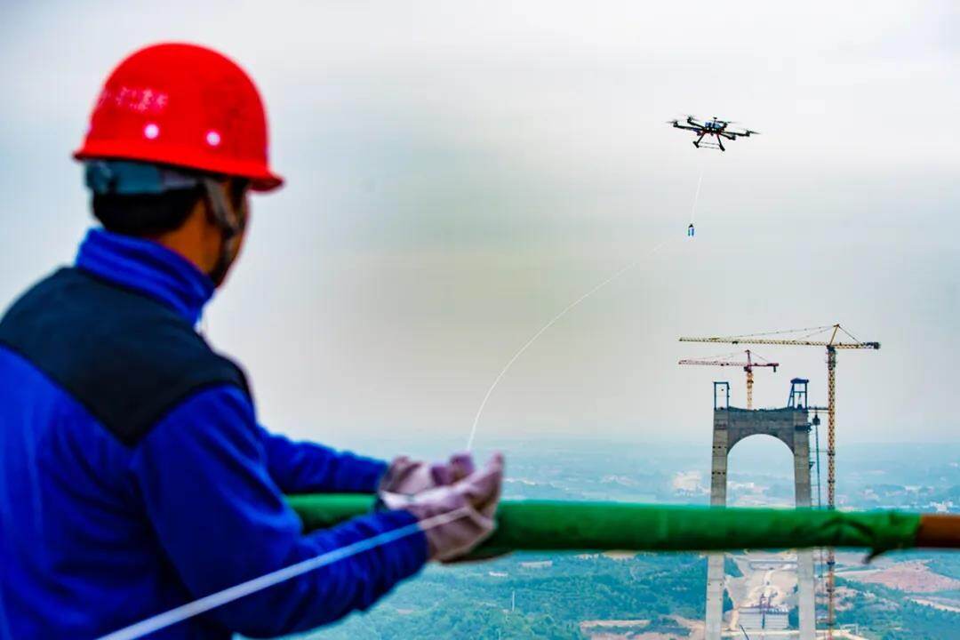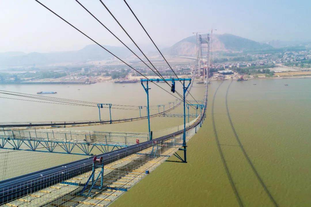In order to reduce the impact on the main channel of the Yangtze River, the bridge uses a drone to pull the pilot cable across the river. The pilot cable uses a high-strength and high-toughness DuPont wire with a diameter of 2.0 mm and a length of 1760 meters. It takes 5 minutes to pass through the main tower of the north and south of the bridge. Based on this cable, the "small rope pulls big rope" method is used to drag and drop, gradually increasing the size of the wire rope to complete the pilot cable erection. The two main cables of the bridge are 1811 meters long and 671 mm in diameter. Each main cable consists of 101 strands Synthetic, the pulling force of a single main cable is about 18540 tons.