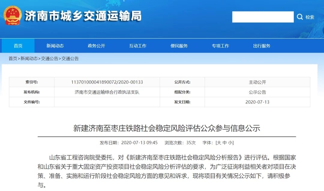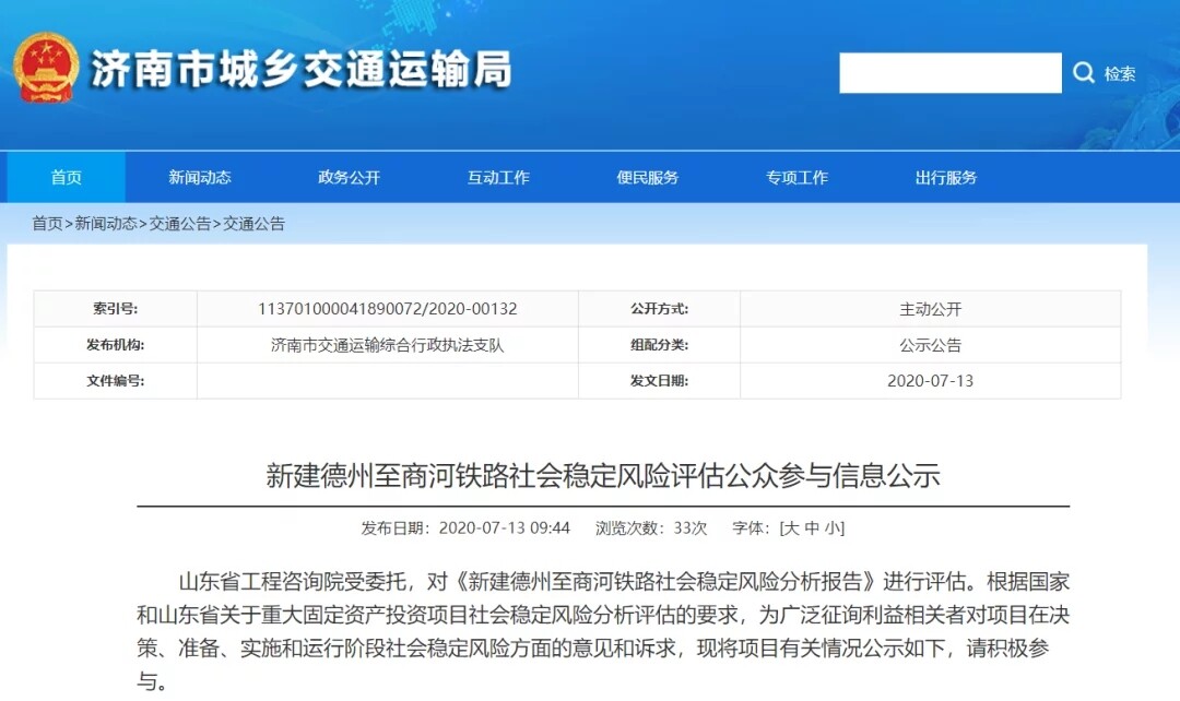 On July 13th, Jinbin, Deshang, and Jizao high-speed rail ushered in new progress! The website of Jinan Municipal Transportation Bureau publishes the “public announcement of public participation information for the social stability risk assessment of the newly built Jinan-Binzhou Railway”, the “public announcement of public participation information for the social stability risk assessment of the new Dezhou-Shanghe Railway” and the “public assessment of the social stability risk assessment of the new Dezhou to Shanghe Railway” Participate in information publicity.