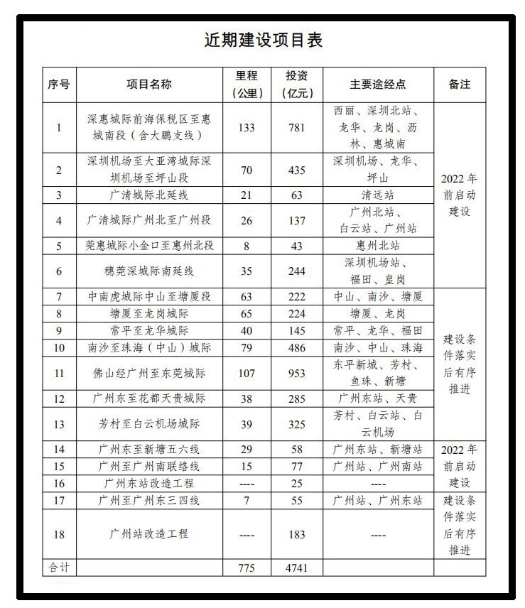 In terms of short-term construction arrangements, 13 intercity railways and 5 hub projects are planned to be constructed with a total mileage of approximately 775 kilometers, forming an intercity railway network with strengthened main axis, regional coverage and hub connections. Among them, six intercity railway projects including the Shenzhen Airport to Daya Bay Intercity Shenzhen Airport to Pingshan Section, the Guangqing Intercity North Extension Line, and the Guangzhou East Railway Station renovation project will be launched before 2022. The planned construction mileage is 337 kilometers. After the relevant construction conditions are implemented, seven intercity railway projects from Tangxia to Longgang and Changping to Longhua, and two hub projects including the Guangzhou Station Reconstruction Project will be implemented in an orderly manner, with a planned construction length of 438 kilometers.