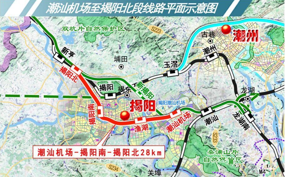 The eastern Guangdong Intercity Chaoshan Airport to the southern section of Jieyang is located in the territory of Jieyang City. The line starts from Chaoshan Airport Station in the east, passes through the East China Sea, Yuhu Lake, and ends at the Intercity Jieyang South Station. It is an elevated station with a designed speed of 160 km/h and an estimated investment of 5.229 billion yuan.