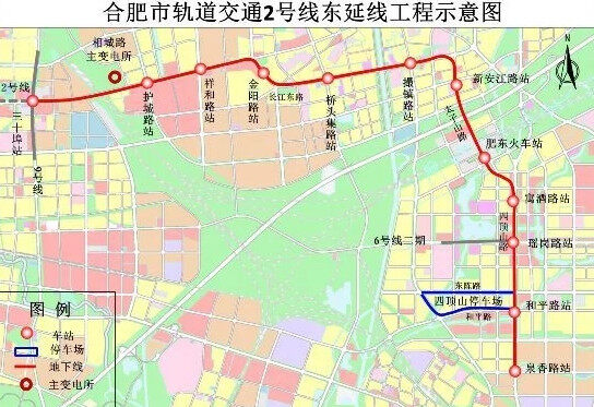 The east extension of Line 2 starts at Sanshibu Station, the terminus of Line 2. After exiting the station, the line is laid along Changjiang East Road, planned Taizishan Road and planned Sidingshan Road, and ends at the intersection of Sidingshan Road and Quanxiang Road Quanxiang Road Station, the total length of the line is about 14.5 kilometers, all of which are underground lines. A total of 11 stations are arranged, namely Hucheng Road Station, Xianghe Road Station, Jinyang Road Station, Qiaotouji Road Station, Cuozhen Road Station, Xin'anjiang Road Station, Feidong Railway Station, Yujiu Road Station, Yaogang Road Station, Heping Road Station and Quanxiang Road Station.