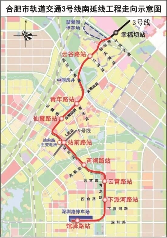 The southern section of the South Extension Line of Line 3 starts at Guanyi Road Station. After exiting the station, it is laid along Shenzhen Road to the east. After passing through the Shenzhen Road parking lot access line, it turns to Qinglong Road and goes to Qinglong Road and Zhanqian Road intersection. The front road goes west, after bypassing Mingbang Square, turn to Jinzhai South Road to the north, go to Paihe Avenue, go down through the Yinjiang-Jihuai Project to Feicui Road, continue to the north along Feicui Road, to the Xingfuba Station, the end of the line, the line is full 11.3 kilometers long, all underground lines. A total of 8 stations are arranged, namely Guanyi Road Station, Xiapaihe Road Station, Yunxiao Road Station, Ruici Road Station, Zhanqian Road Station, Xianxia Road Station, Qingnian Road Station and Yungu Road Station.
