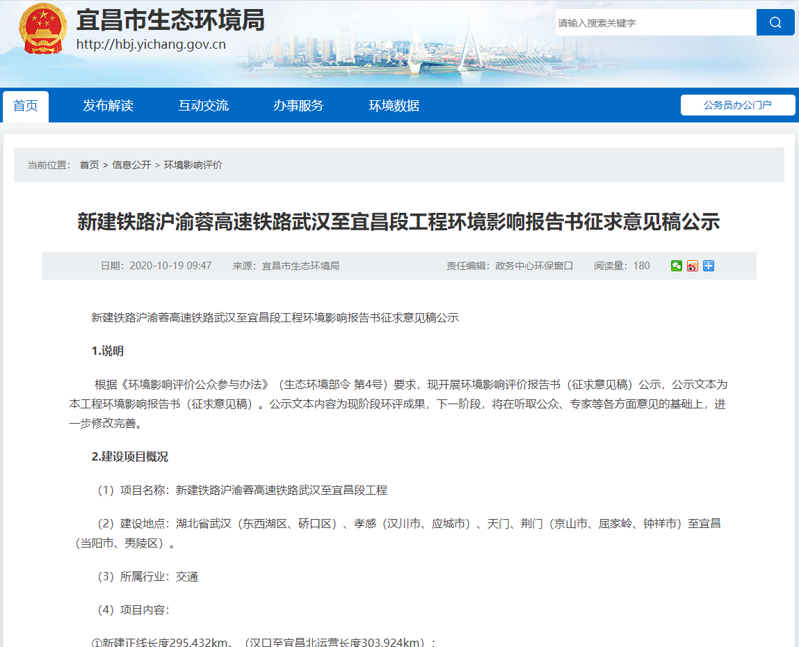 On October 19, 2020, Jiandao.com learned from the official website of the Yichang Municipal Ecological Environment Bureau that the Fourth Railway Institute officially released the draft environmental impact report on the Wuhan-Yichang section of the new Shanghai-Chongqing-Rong high-speed railway. The Wuhan-Yichang section of the Shanghai-Chongqing-Rongjiang high-speed railway (high-speed rail along the river) is expected to start construction at the end of the year.