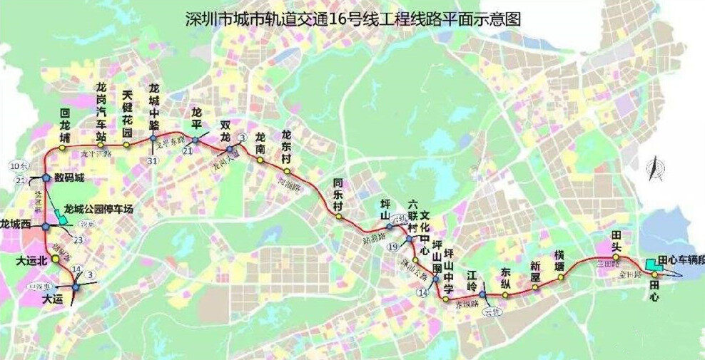 Shenzhen Metro Line 16, the line starts at Universiade Station, passes by Universiade New Town, Longgang Central City, and leads from Universiade Station. It is laid along Longgang Avenue, Huangge Road and Longping Road, and passes through Longgang Old Center and then along Shenshan Highway South to Pingshan Station, after passing through the central area of Pingshan, follow Dongzong Road and Jintian Road, and stop at Tianxin Station.