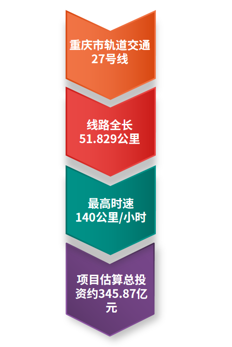 Chongqing Rail Transit Line 27 project starts at Bishan Station and passes through Huxi Station, University Town South Station, Zhaishanping Station, Xiyong Station, Ciqikou Station, Shapingba Station, Shiqiaopu Station, Dapingxi Station, Chongqing Station , Houpu Station, Nanping Station, Guangfu Avenue Station, and the end point is Chongqing East Station. The total length of the line is 51.829 kilometers, with 14 stations, including one elevated station, which is Bishan Station (implemented by the Bitong Line of the Suburban Railway), and the remaining 13 are all underground stations. Set up Chongqing East Depot and Bishan Parking Lot. The line is two-lane, adopts the right-hand driving system, adopts urban rail express trains with a maximum operating speed of 140 km/h and 25kV AC system, and uses 6 formations. The initial, short-term and long-term distribution of the project are 30 trains/180 vehicles, 36 trains/216 vehicles and 45 trains/270 vehicles respectively. The estimated total investment of the project is about 34.587 billion yuan and the construction period is 72 months.