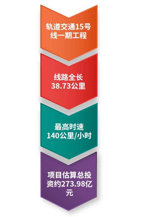The first phase project of Line 15 starts at Jiuquhe East Station and passes through Chongguang Station, Long'an Road Station, Jintong Road Station, Guotang Road Station, Southwest University of Political Science and Law Station, Baosheng Lake Station, Xiuhu Road Station, and Terminal T3 Station, Longjun Avenue Station, Liangjiang Avenue Station, Fusheng Station, Modern Avenue Station, and the terminal is Liangjiang Film and Television City Station. The total length of the line is 38.73 kilometers, including 35.463 kilometers of underground lines (including cut-and-cut sections) and 3.267 kilometers of overhead lines. There are 14 stations on the whole line, all of which are underground stations, of which 7 are transfer stations. There are 2 Jiuquhe parking lots and Tongluoshan parking lots, and 2 Jiuquhe parking lots and 2 main substations of the T3 terminal station, including the main substation of the T3 terminal station and the planned rail transit No. 26 The line is shared, the line is two-lane, the right-hand driving system is adopted, and the urban rail express vehicle with a maximum running speed of 140 km/h and 25kV AC system is adopted. It adopts a 6-vehicle formation, with 19 trains/114 vehicles, 36 trains/216 vehicles, 48 trains/288 vehicles and 64 trains/384 vehicles in the opening year, early, near and long-term vehicles respectively. The estimated total investment of the project is about 27.398 billion yuan, and the construction period is 72 months.